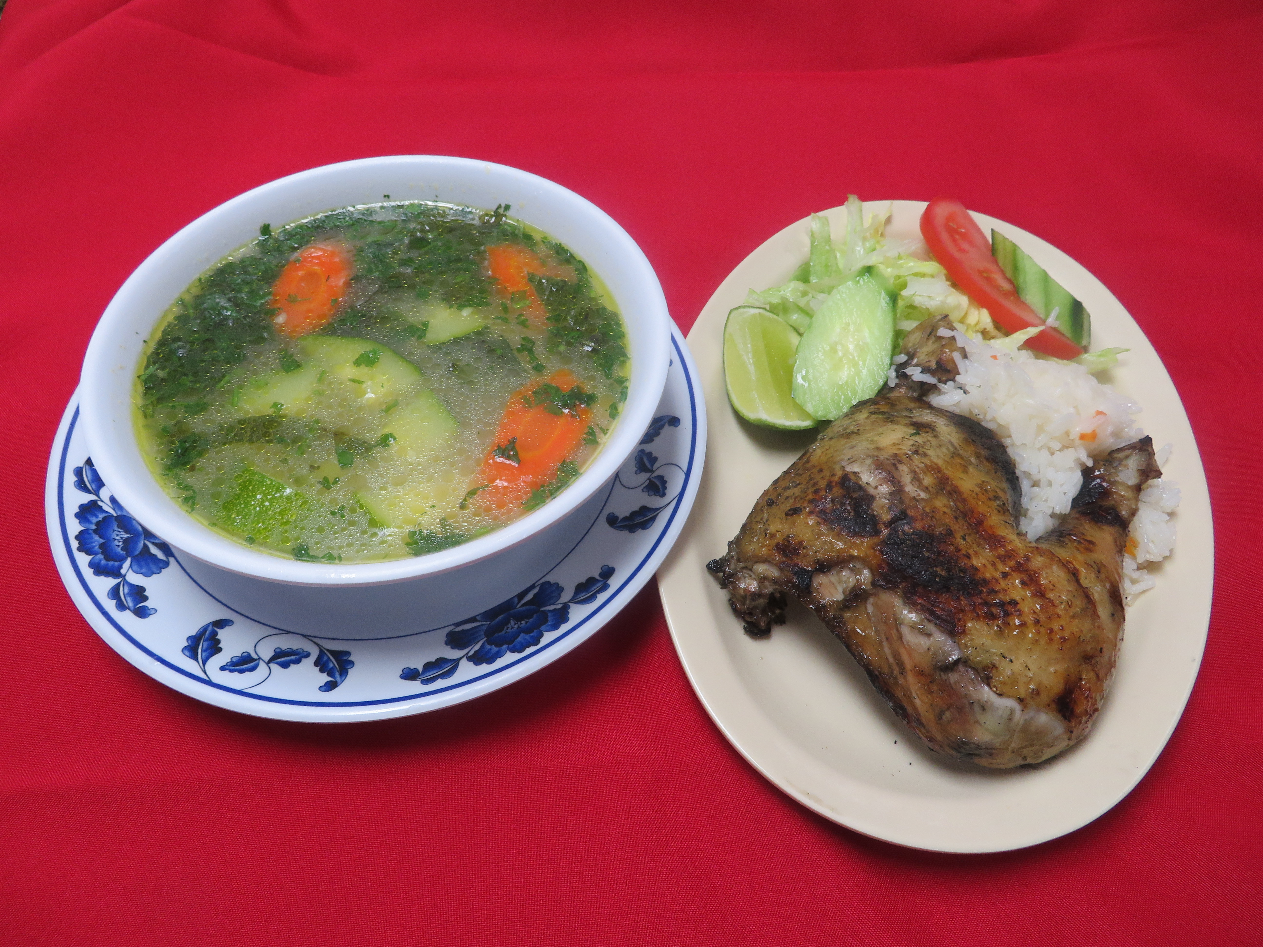 Gallina guisada con arroz, coditos, verduras y 2 tortillas.