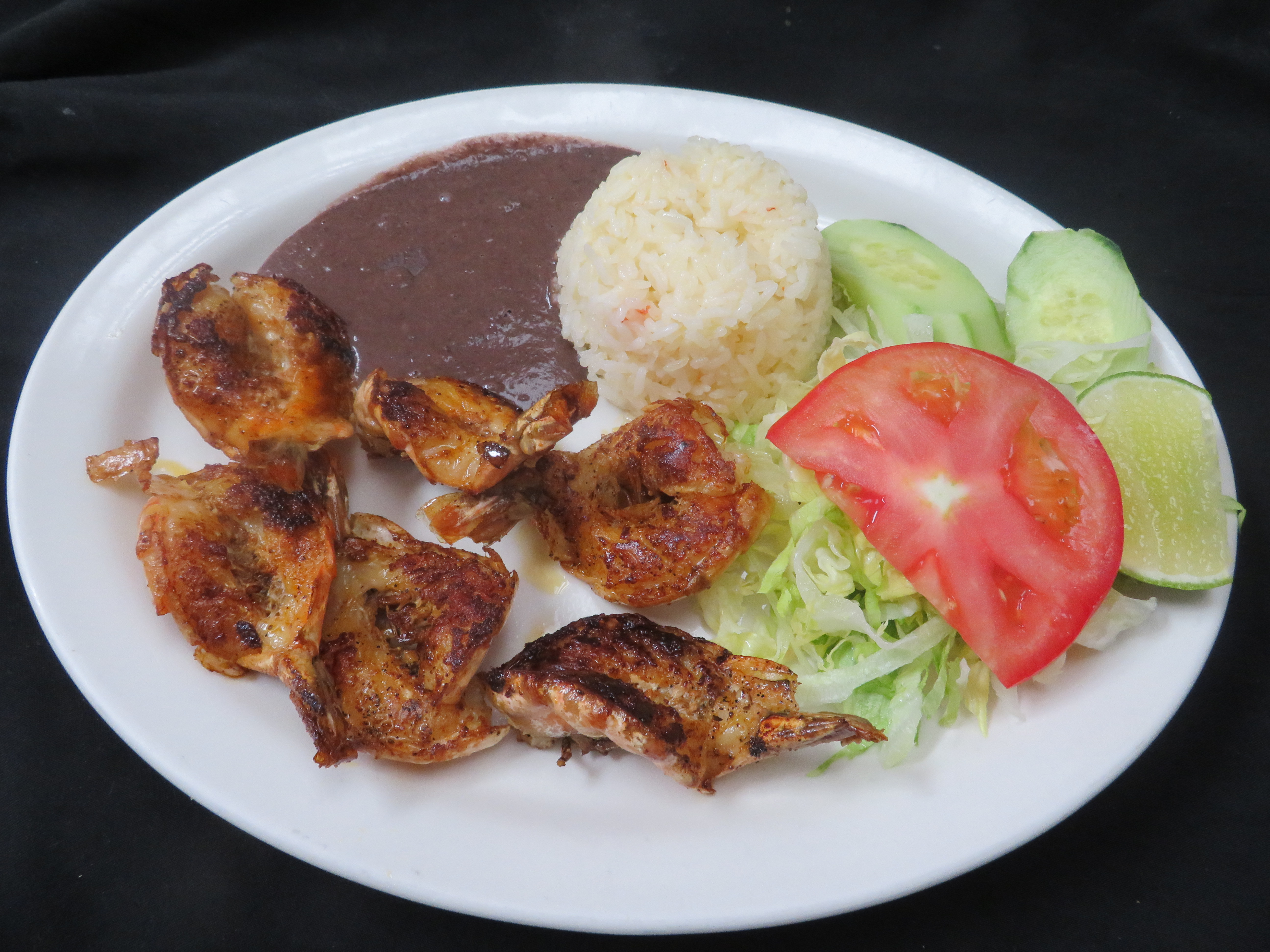 Camarones con arroz y frijoles.