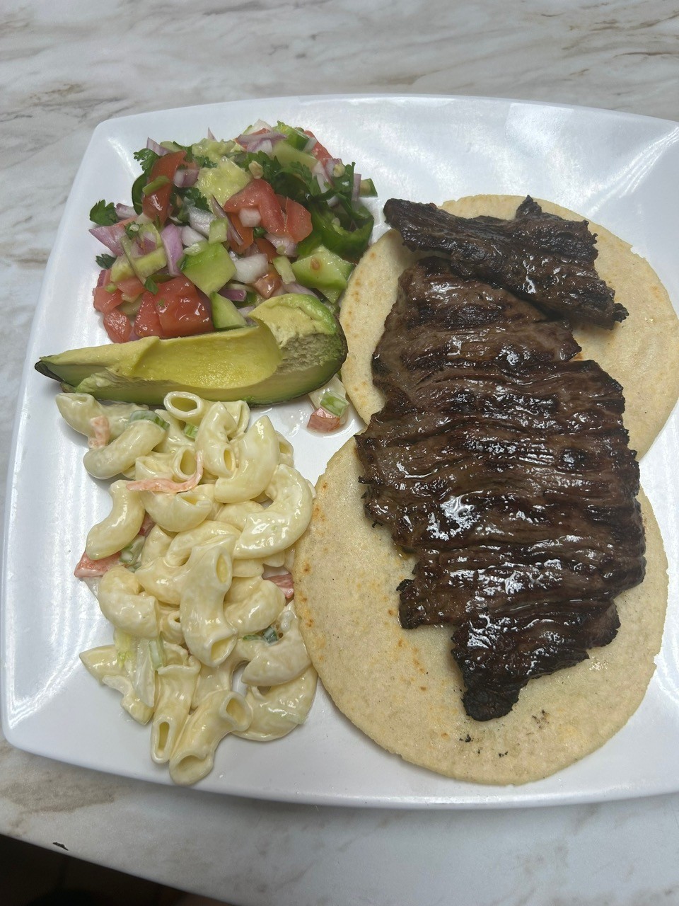 2 tortillas, 1 pedazo de carne, coditos, pico de gallo y un