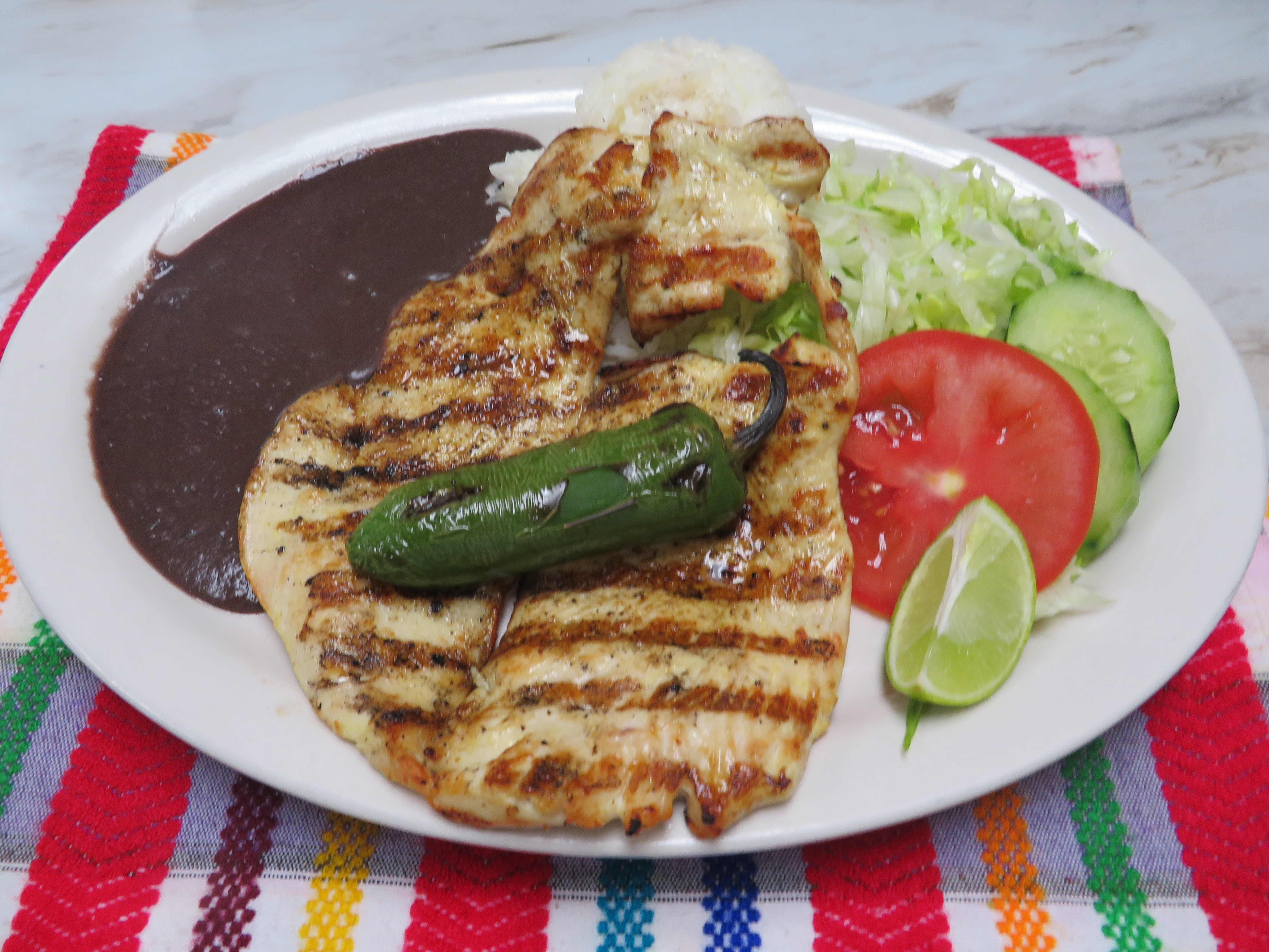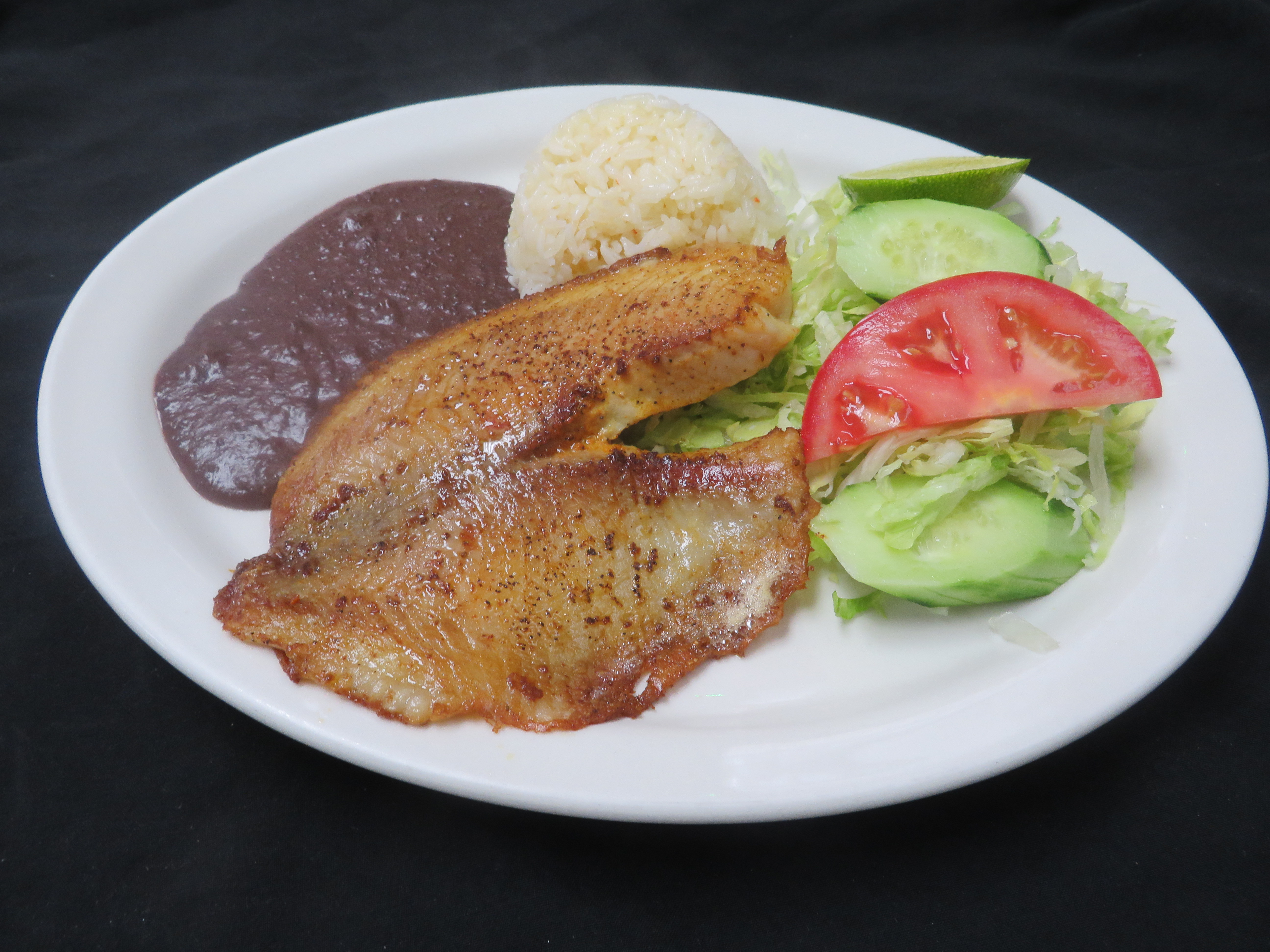 Filete de Pescado con arroz, frijoles, ensalada, y 2 tortillas.