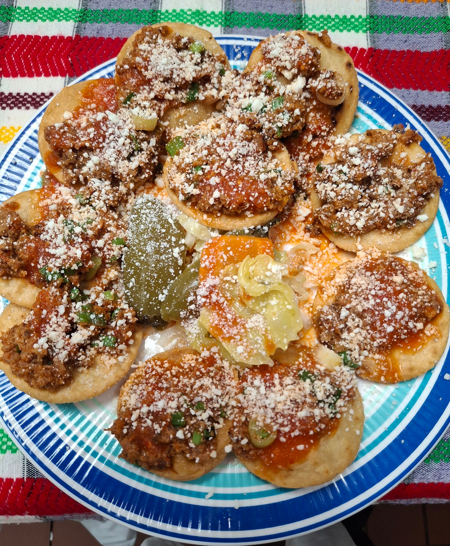 Tortilla de maíz frita con carne, repollo fresco, salsa y queso.