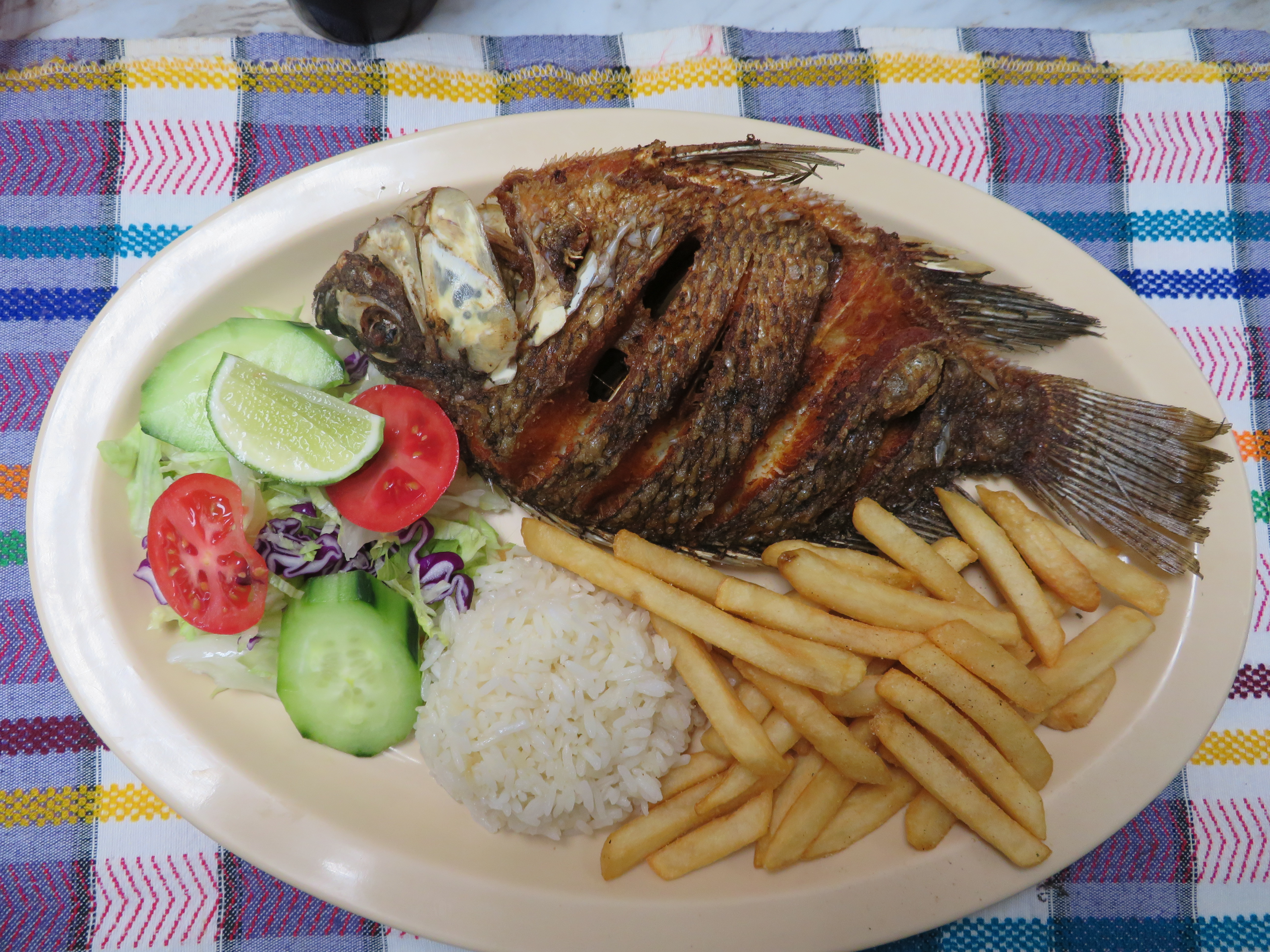Mojarra frita con arroz, papas fritas, ensalada y 2 tortillas.