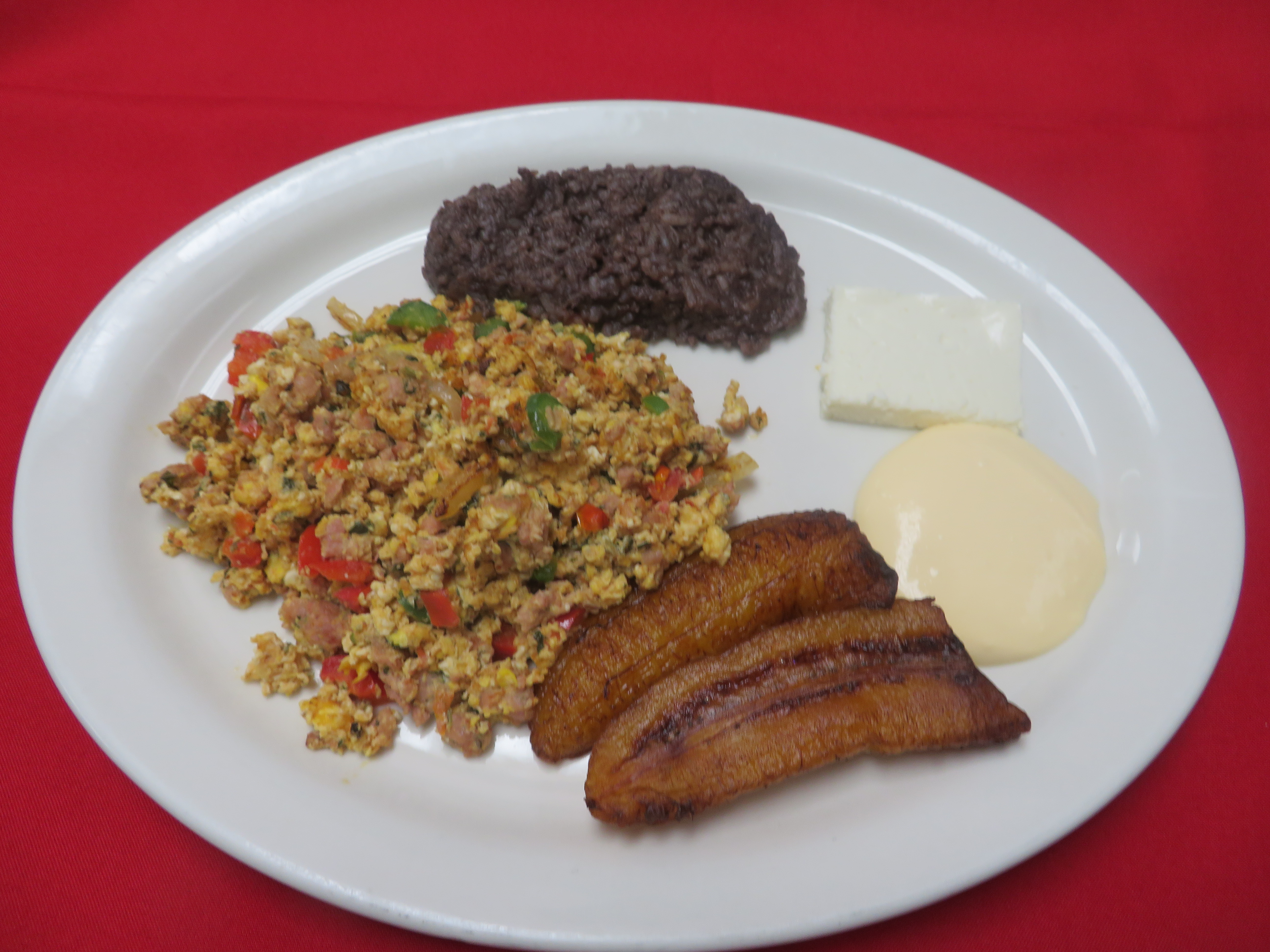2 huevos revueltos con longaniza y verduras, platanos, crema,