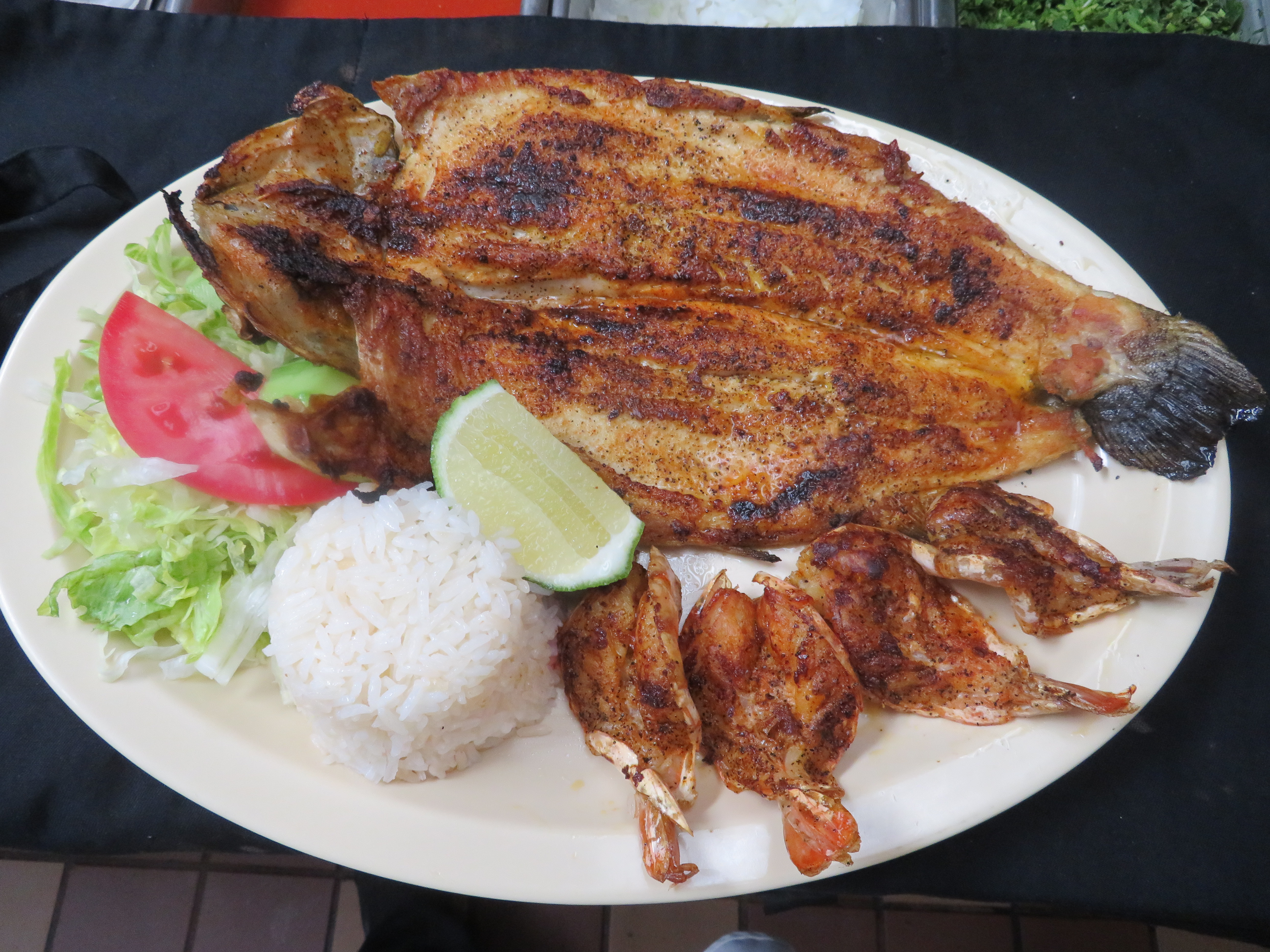 Trucha con camarones, arroz, ensalada, y 2 tortillas.